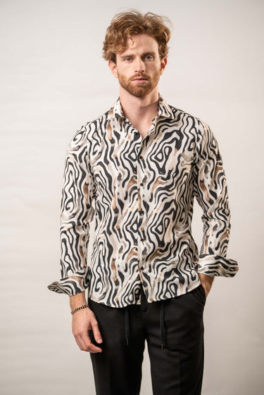 La camicia fantasia optical Karl Mommoo gioca con linee sinuose e colori neutri che si fondono armoniosamente, creando un effetto moderno e sofisticato. Il tessuto leggero e la vestibilità fluida ne fanno la scelta ideale per look distintivi e ricerca